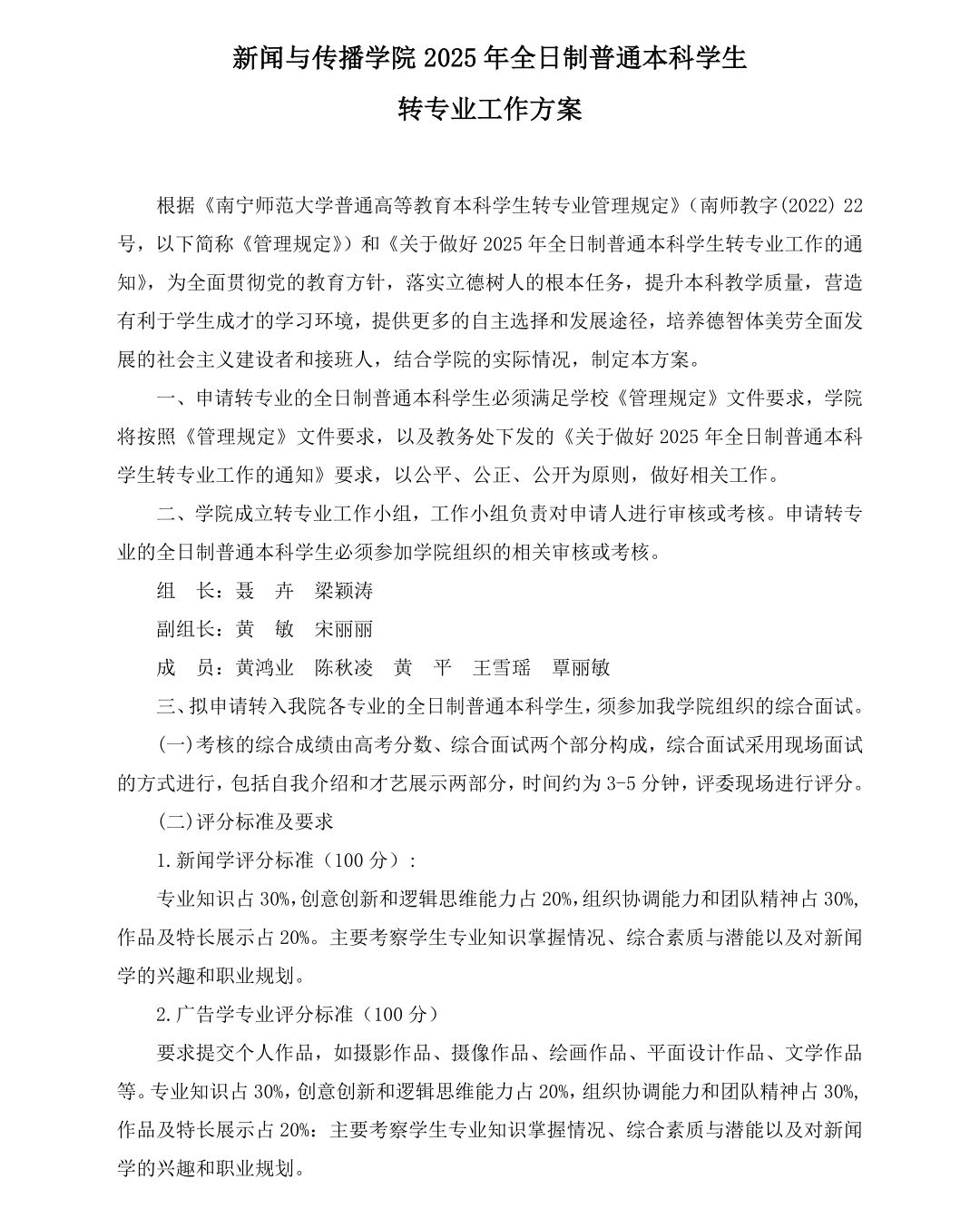 新闻与传播学院2025年全日制普通本科学生转专业工作方案