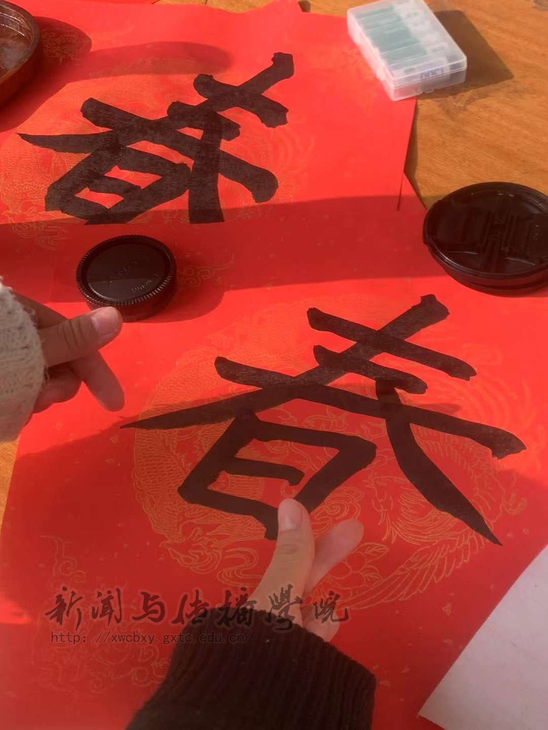 看到桌面上摆放整齐的笔墨纸砚,来自老挝的留学生康麦略带兴奋的说:“陈老师,我在中国读本科的时候了解过书法!”留学生们好奇的围绕在书桌的周围,陈洪波教授一边写着春联,一边对东盟留学生们说:“学习写书法就像学习做人,字要横平竖直,人要端端正正。”随后,在陈洪波教授的指导下,泰国留学生冯春雨认认真真,一笔一划的书写了自己留学生活中的第一张春联——“春”字。“‘春’字不仅仅是我的名字,也代表着春天、春节。在这里祝同学和老师们新春快乐。”冯春雨用一口流利的中文笑着说道。