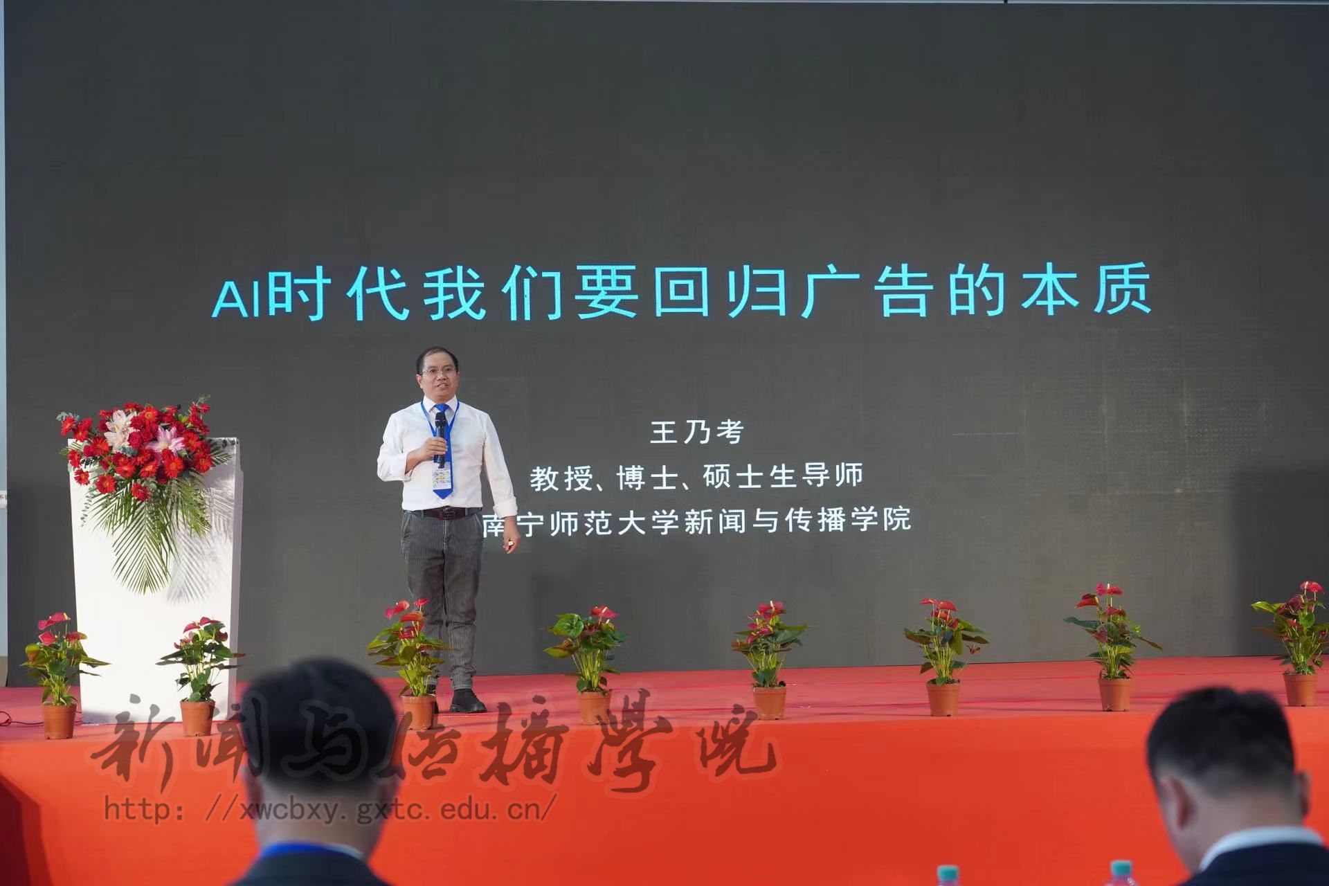 我院教师代表王乃考教授分享了《AI时代让我们回归广告的本质》,旨在解决智能传播背景下广告行业、广告人的面临的困境与焦虑,号召大家在AI浪潮下不要迷失方向。他强调,只要把握广告的本质,坚守广告人的核心使命,不断促进商品生产者与消费者建立联系、达成共识,广告行业还是大有可为的。在互动环节,王教授又把刚刚出版的著作《小红书精细化运营》作为礼物和大家进行了互动,获得了广西广告人的认可,点燃了广西广告人的热情。