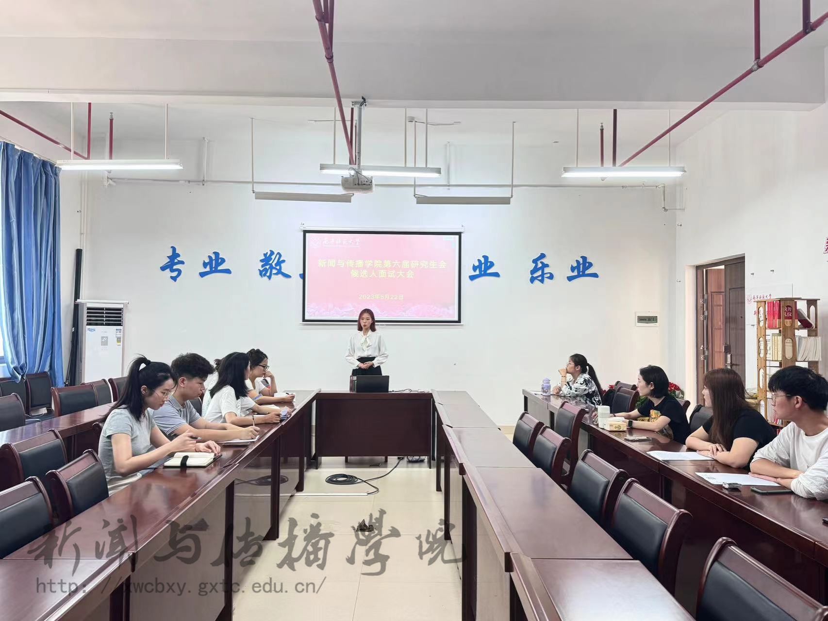 5月22日中午,新闻与传播学院第六届研究生会候选人面试大会在理综楼304会议室顺利开展。由学院团委书记李樱花和研会主席团成员担任本次面试大会的面试官。