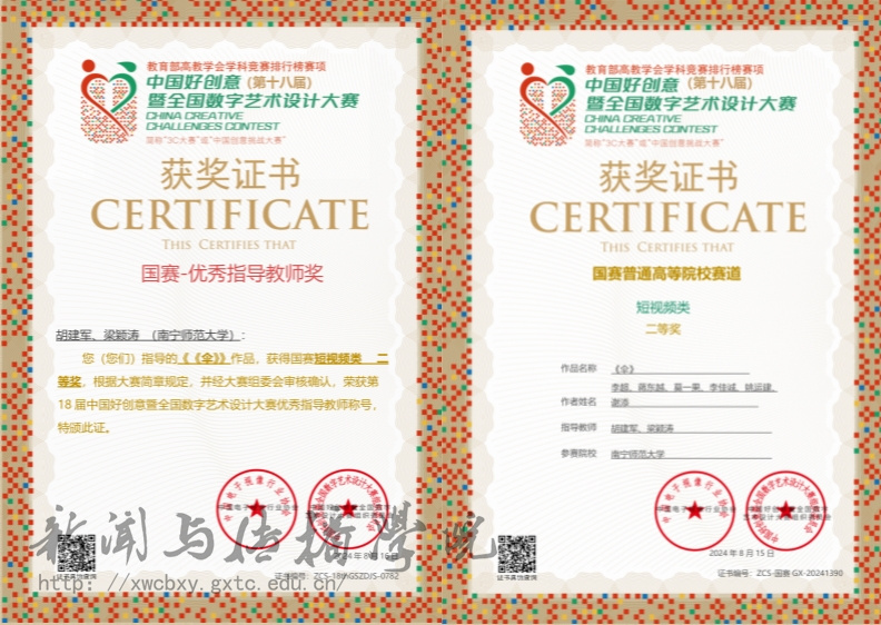 近日,2024第18届中国好创意暨全国数字艺术设计大赛圆满落幕。我院参赛选手李超、蒋东越等人的作品《伞》荣获全国短视频类二等奖,江秋梅、陈晓敏的作品《百事从欢》获得全国红色主题类三等奖。胡建军、梁颖涛老师荣获全国赛区优秀指导教师奖,邓之湄老师获得广西赛区优秀指导教师奖。这是我院广播电视学专业师生首次参加此赛事,是在全国性赛事中的又一次重要突破。