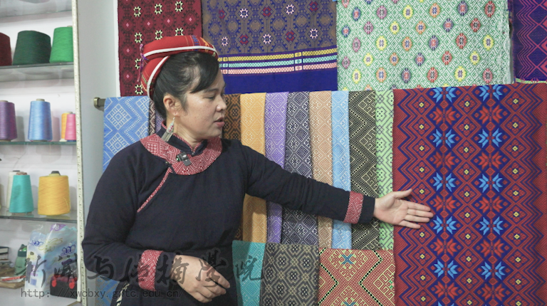 (国家级非物质文化遗产传承人李素英给同学们讲解壮锦图案)