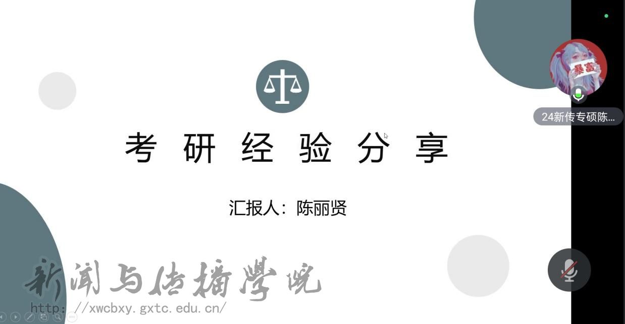 新闻与传播学院于 11 月 9 日晚举办了一场考研经验线上分享会,旨在为有志于考研的在校学生提供实用指导与经验借鉴。本次分享会邀请到 2024 届考研成绩优异的毕业生代表陈丽贤和张可心两位同学,通过线上平台分享她们的考研心得,学院辅导员惠璇老师也同步参与,活动由团委学习部罗程程同学主持。