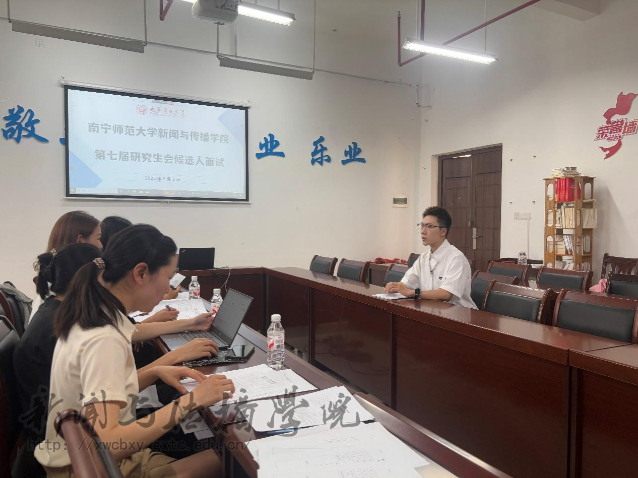 6月5日,新闻与传播学院第七届研究生会候选人面试在理综楼304室举行。此次面试由第六届研究生会主席袁潮平主持,团委书记李樱花出席会议。