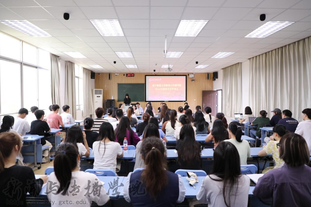 学院副院长(主持行政工作)梁颖涛在典礼上致辞。他向全体2024级研究生的到来表示热烈欢迎,并简要介绍了学校、学院发展情况。他指出,AIGC的产生与发展为新闻传播学科带来了机遇和挑战。作为新传学子,应当从四个层面来提升自我,发挥自身作用,一是加深对导师、学科的了解与认识,围绕学院的特色学科展开研究与学习;二是要深入思考、研究各项新技术对新闻传播业的影响;三是研究动作要快,在层出不穷的传播现象与实践中敏锐发现研究重点,尽早切入到研究实践当中,阅读动作则要慢,积极广泛阅读经典学术著作,耐心沉淀学术底蕴素养;四是要注意锻炼,始终将身体健康放在首位,拥有一个健康的体魄是开展学术研究的基石。他希望大家能够在三年的研究生学习时光里能学有所成。