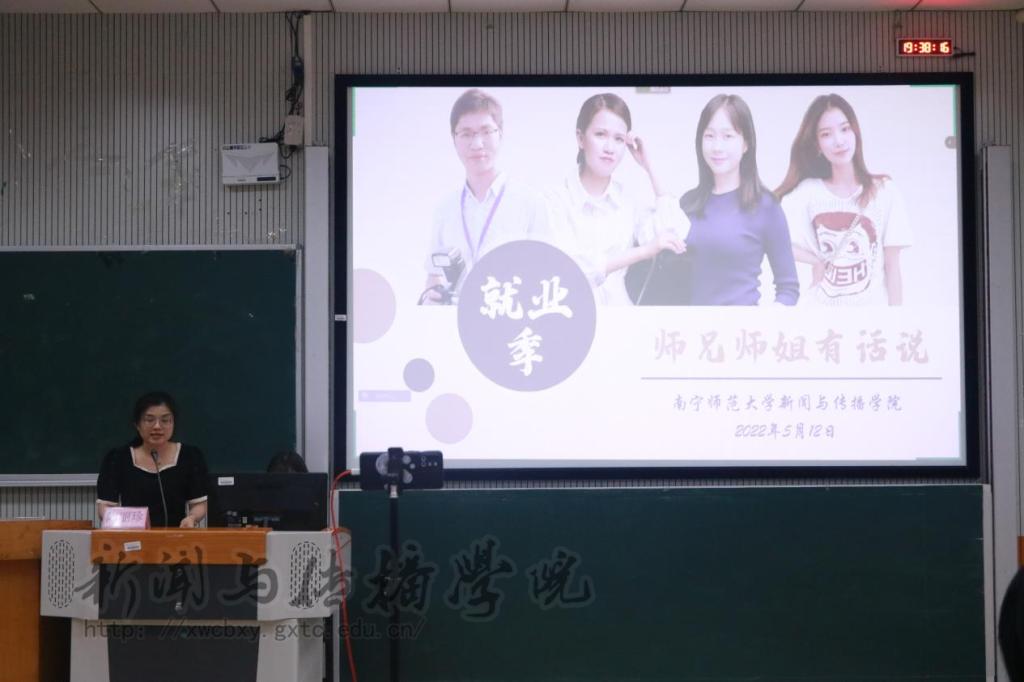 2013届广告学专业校友、玉林日报社新媒体中心运营组组长潘泓霖以新媒体运营为例,将如何运营并发展一个新媒体账户的方法分享给同学们。她给出了四点建议:一是要摆正自己的就业心态,树立正确的人生观、世界观和价值观;二是保持良好的心理素质,不盲目与他人进行攀比;三是增强个人的核心竞争力,尽可能重视每一次机会;四是积累扎实的专业知识和社会实践能力,让自己“动起来”。